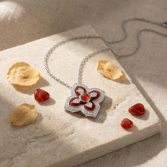 Floral Fire Flower Carnelian and Pave' Diamond Pendant Necklace